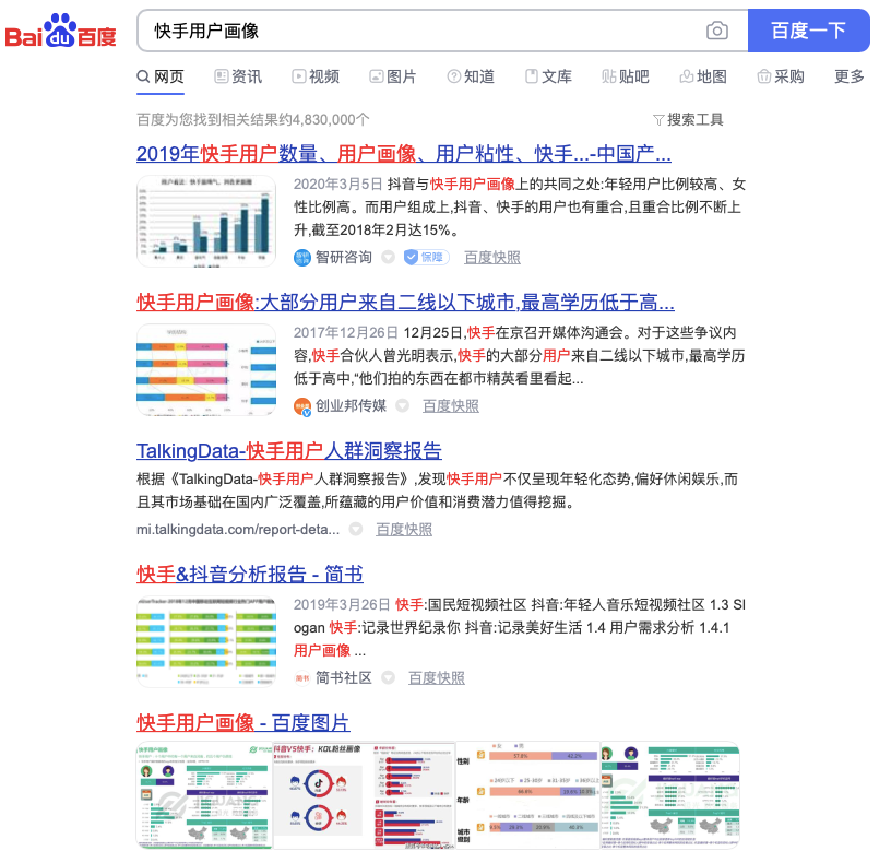 可以看到,介绍部分包括了不少综艺节目的介绍,那么肯定也有不少明星和节目的粉丝聚集在这里。此外,我们也可以在网上搜索相关信息,进一步了解快手。比如直接在百度搜索“快手用户画像”,能找到一些专门机构做的用户画像分析。