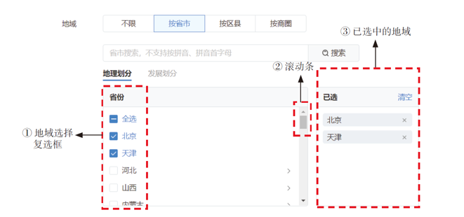 - 复选框。可以选择任意个选项,比如地域定向。我国有这么多的城市,像“性别”那种方式都展示出来,一个屏幕都放不下,怎么办呢?这时就出现了另一种方式,叫“复选框”。