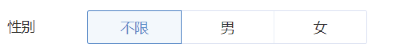- 单选按钮。只能选择其中一个选项,比如下图对于性别的设置,有“不限”“男”“女”3个选项。“不限”的意思就是男女都可以,在性别上没有区分。