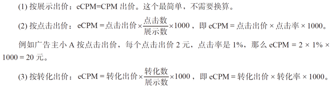 但在用户看见广告之前,大家并不知道真实的CPM是多少,所以广告后台会对CPM进行预估,我们平时看到的eCPM基本上是CPM的预估值。对应地,计算eCPM的过程中也需要使用预估点击率和预估转化率。但因为我们平时较少接触到预估的点击率和转化率,所以下文就简化写成“点击率”和“转化率”了。