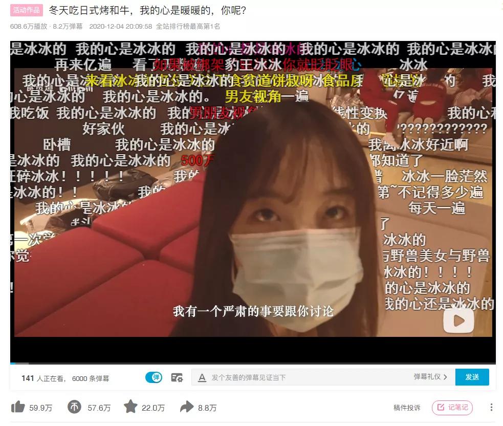 我们再来看看最近一个很火的关于“王冰冰”的视频,那就是饼叔12月4日发布的《冬天吃日式烤和牛,我的心是暖暖的,你呢?》,这个视频截止目前608万播放,也是全站排行榜最高第1名。