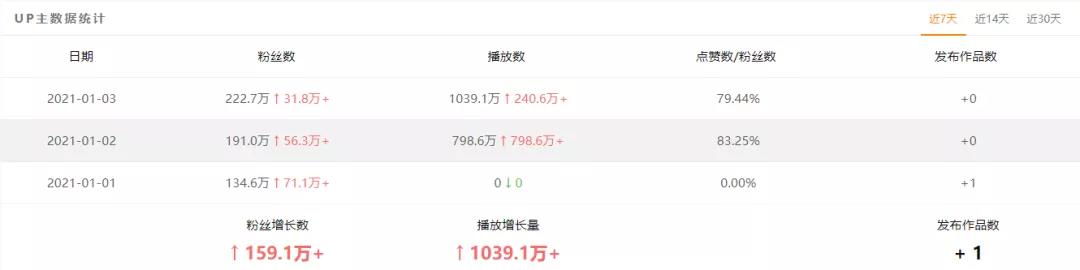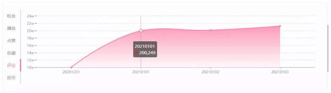这个视频发布之后10小时14分 突破百万粉丝,三天之内突破两百万粉丝。我上上篇文章《2020年关于B站营销的12个方向建议》有提过,B站的爆款营销链路很短,长时间触达→聚拢→发酵这套下来基本过了保鲜期,3天是验证一个内容的时间门槛,3天内火不火?有没有热度?数据基本会说的很清楚。