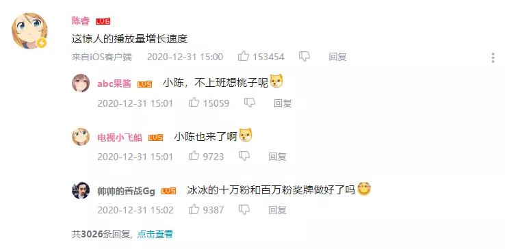 当播放和粉丝数都在高速增长的时候,我们再看用户的评论数,在1月1日之后进入了缓慢期,说明了1月1日之后的增长数据大多是基于热度扩散的围观。其中有个现象是评论区中引发了大量的官号围观,这个行为和企鹅憨憨B站走红记“逗鹅冤”事件如出一辙。
