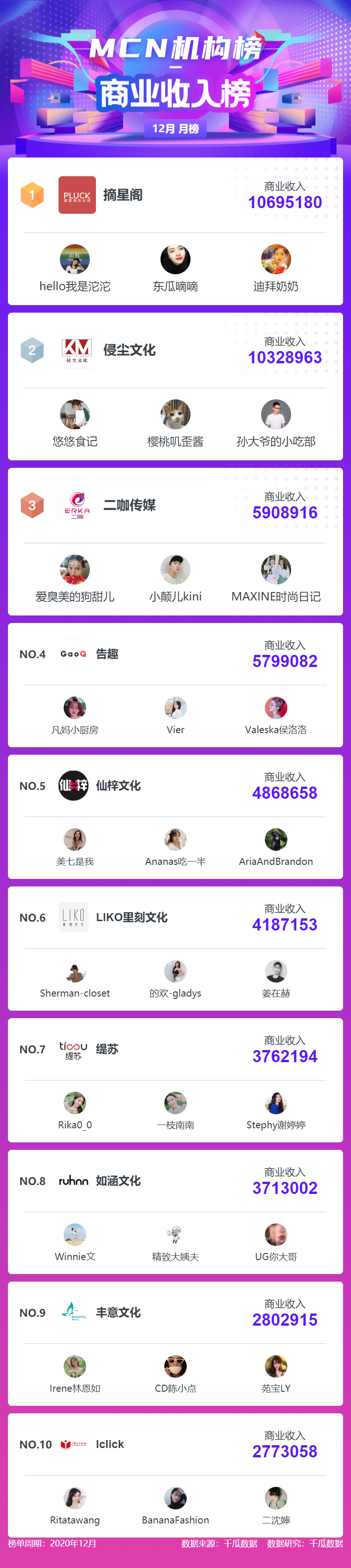 MCN机构榜-商业收入榜中“摘星阁”排名第一,商业收入10695180;“侵尘文化”排名第二,商业收入10328963;“二咖传媒”排名第三,商业收入5908916。