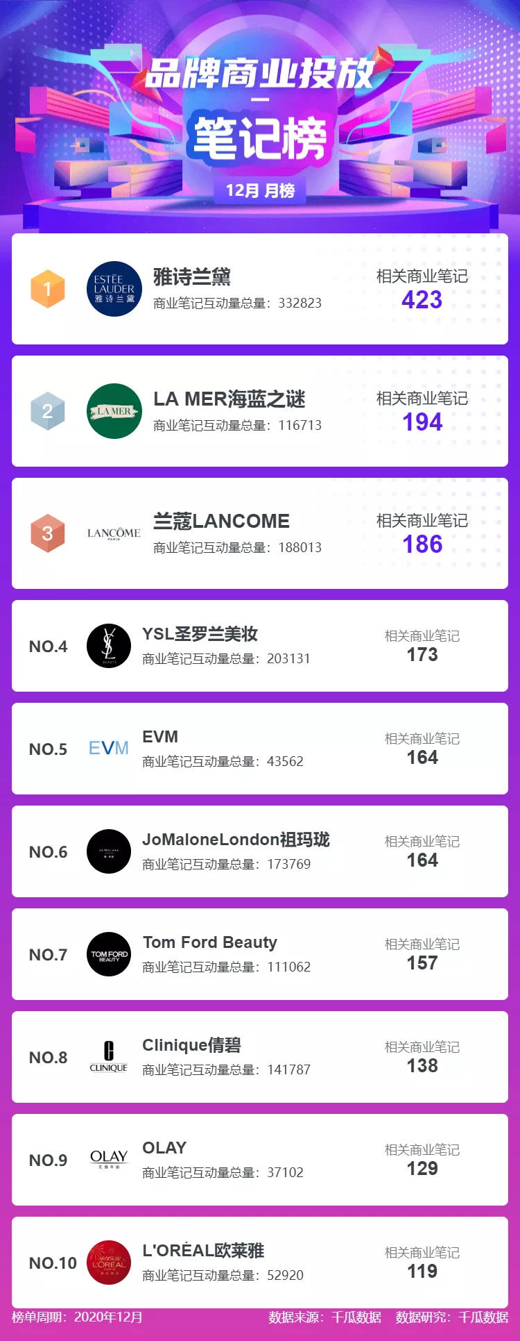 品牌商业投放榜-笔记榜中“雅诗兰黛”排名第一,相关商业笔记423;“LA MER海蓝之谜”排名第二,相关商业笔记194;“兰蔻LANCOME”排名第三,相关商业笔记186。