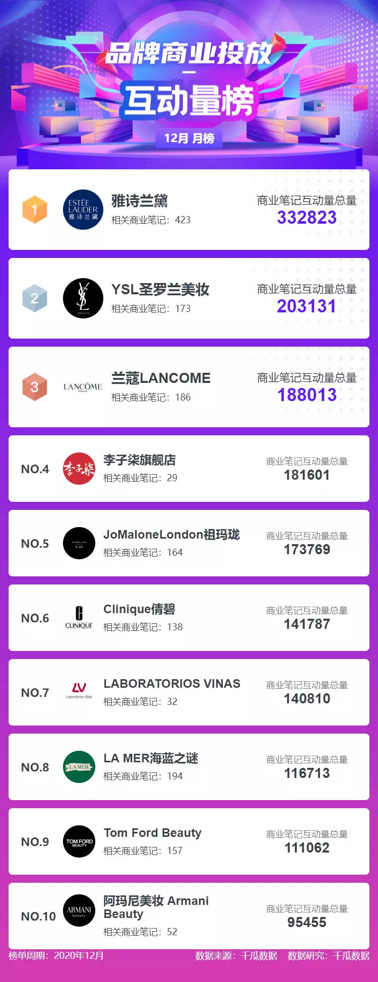 品牌商业投放-互动量榜中“雅诗兰黛”排名第一,商业笔记互动量总量332823;“YSL圣罗兰美妆”排名第二,商业笔记互动量总量203131;“兰蔻LANCOME”排名第三,商业笔记互动量总量188013。