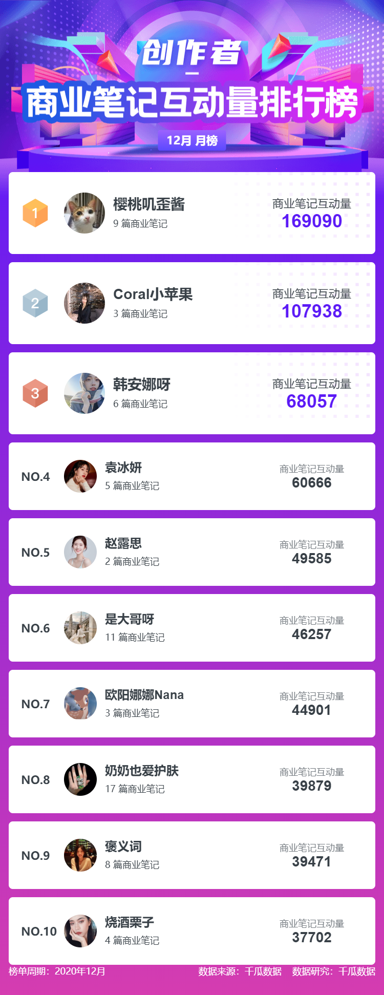 创作者-商业笔记互动量排行榜中“樱桃叽歪酱”排名第一,商业笔记互动量169090;“Coral小苹果”排名第二,商业笔记互动量107938;“韩安娜呀”排名第三,商业笔记互动量68057。