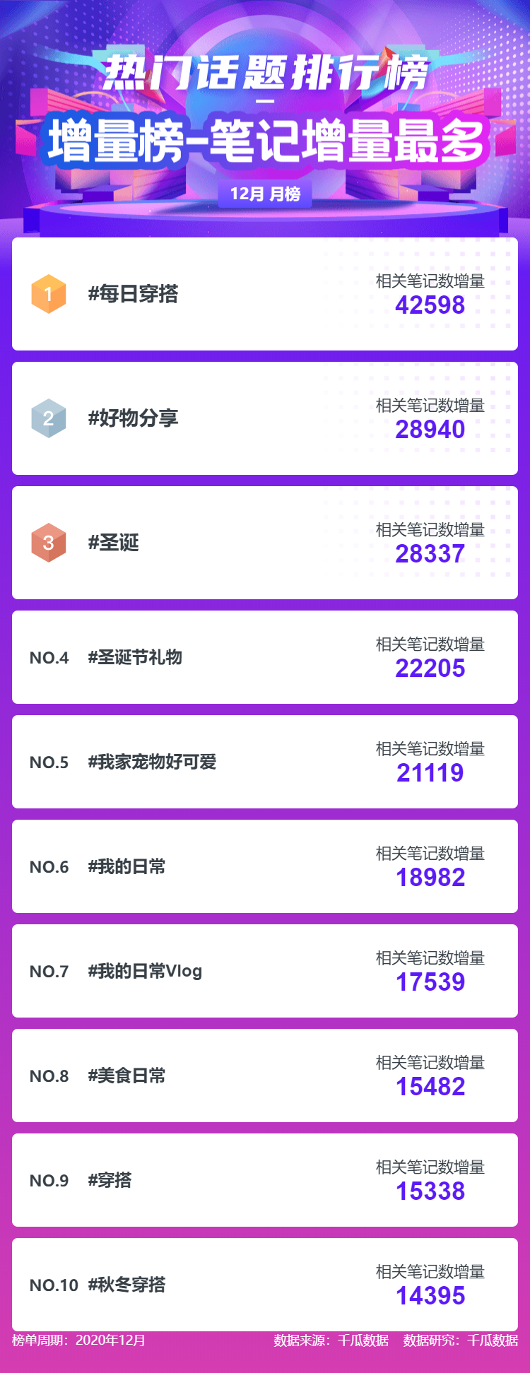 热门话题排行榜-增量榜中“每日穿搭”排名第一,相关笔记数增量42598;“好物分享”排名第二,相关笔记数增量28940;“圣诞”排名第三,相关笔记数增量28337。