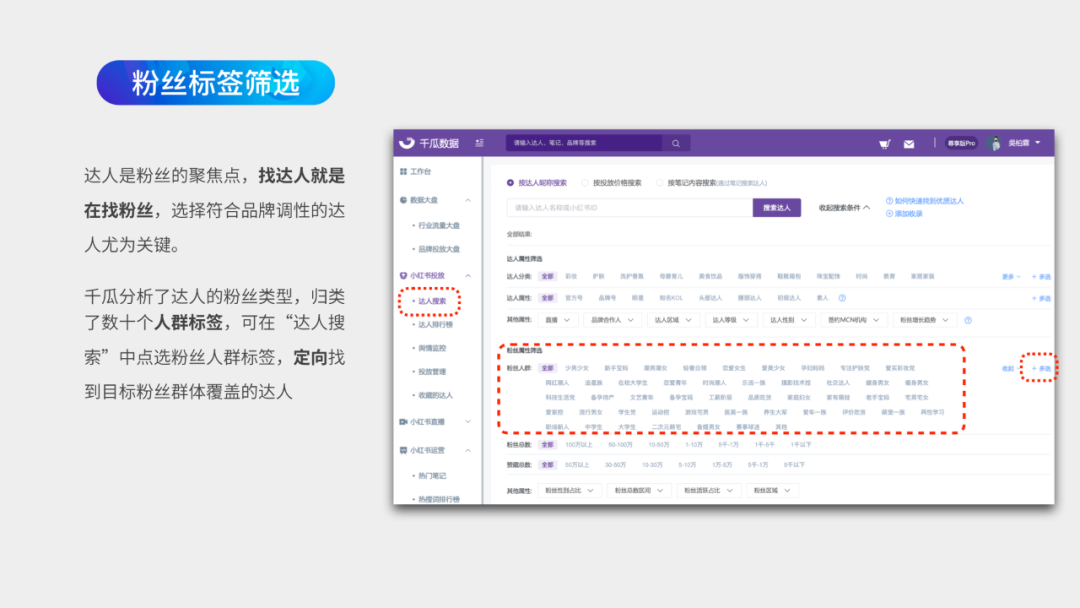 千瓜优质达人库帮助小红书品牌方、小红书MCN机构快速找到优质达人,更好的进行小红书推广投放;帮助小红书用户快速了解自己运营的账号数据情况,为优化数据提供数据支持。