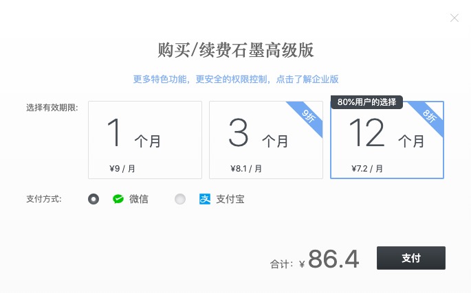 价格锚应用在产品领域多数在于增值服务转化上, 如下图的石墨文档购买高级版,在产品层面无非就像让用户立即付费,所以在服务期限锚定在12月,突出价格实惠程度,刺激用户购买来降低用户心理压力,潜意识认为也就7块2一个月,使用户比较容易接受。