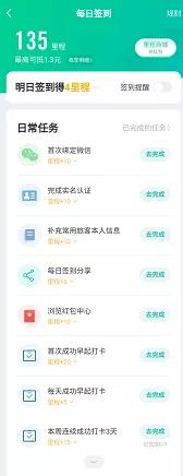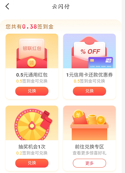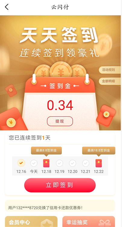 在签到的页面中,设置了第3天和第7天的红包激励,标明了金额,引起用户的兴趣,只要我坚持签到,我就能领取8.8元、18.8元的奖金了。通过签到,吸引用户每天打开云闪付,提高云闪付APP的活跃。