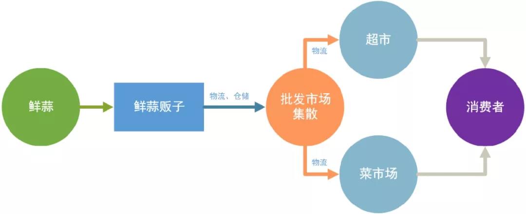 大蒜从出土到消费者手中,需要经历多个环节,每一个环节都有成本、都要利润,溢价可想而知。