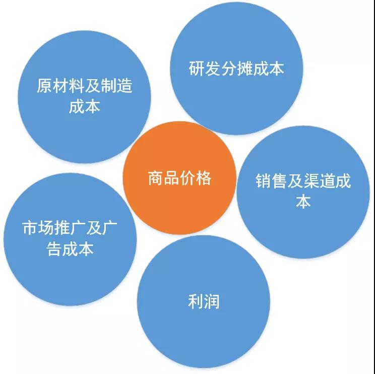 商品价格 = 原材料及制造成本+研发分摊成本+市场推广及广告成本+销售及渠道成本+利润