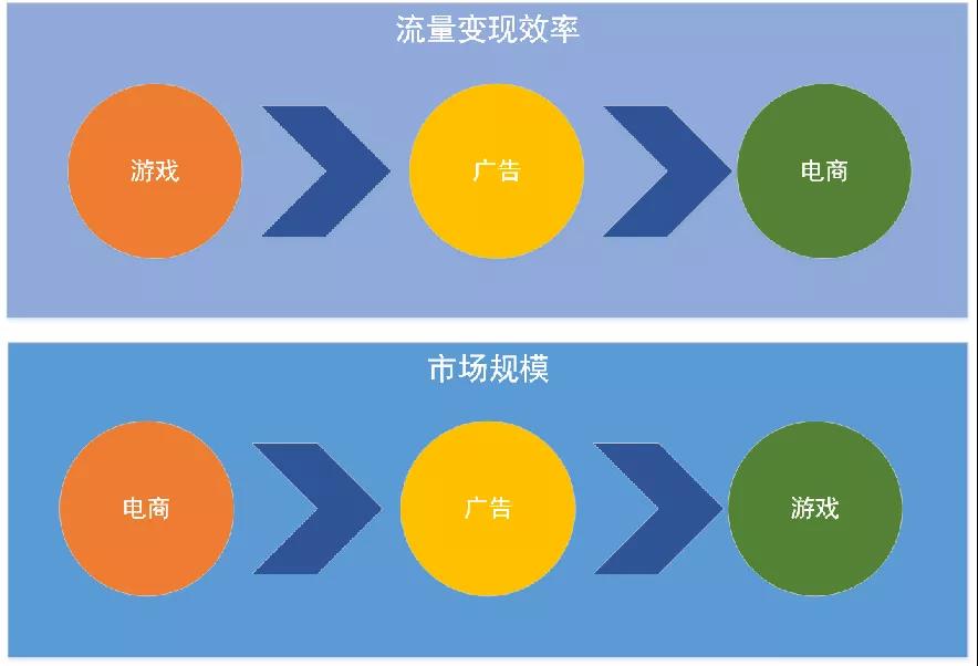 一般情况下,游戏的流量变现效率最高,广告次之,电商最次;但在市场规模方面,电商的市场规模最大,广告次之,游戏的市场规模最小。