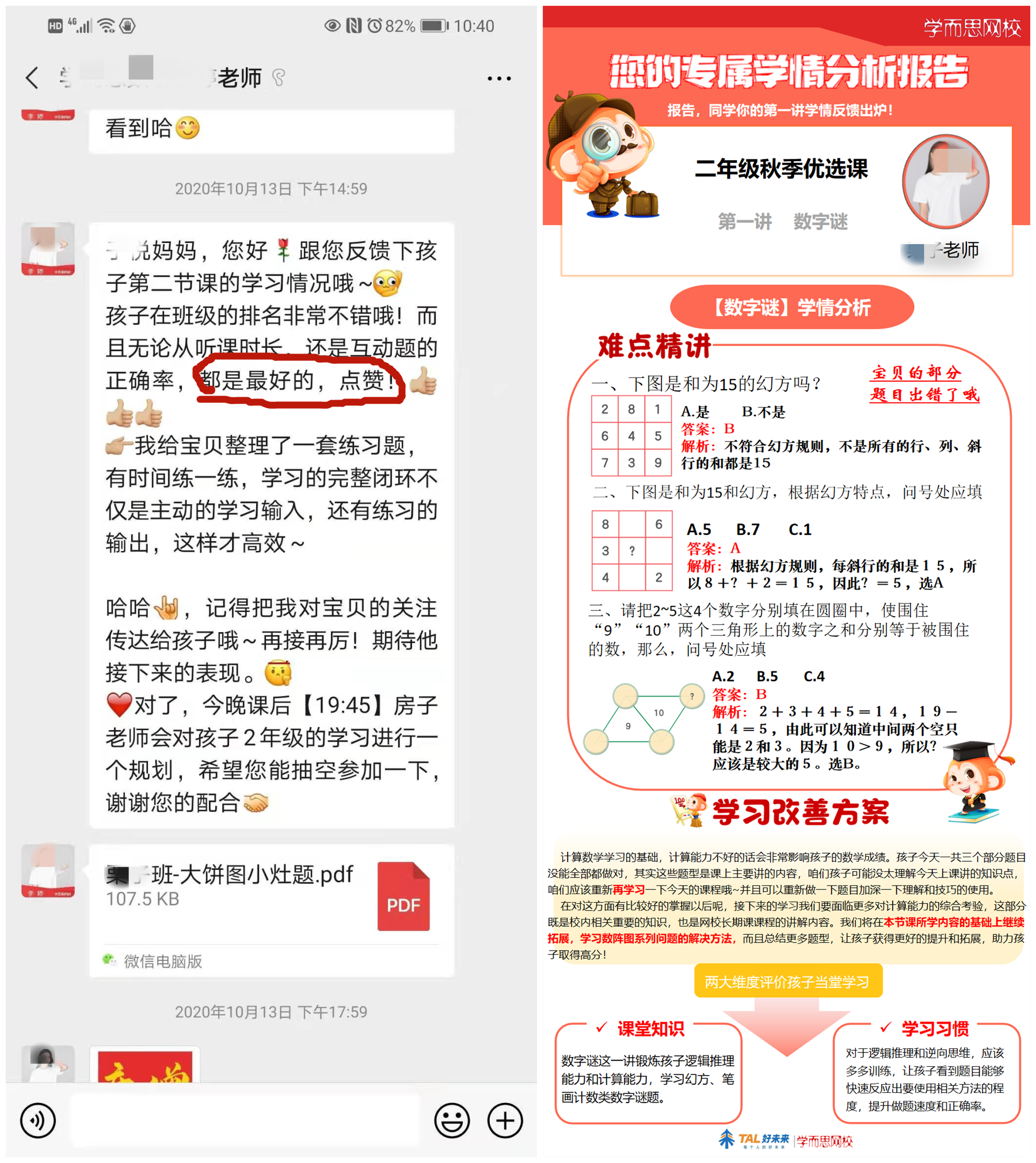 具体做法:学而思在每堂课结束后,老师都会认真点评我家孩子的表现,同时还会出具学习报告,因为孩子每次的表现、老师的点评都是未知的,我尤为期待。