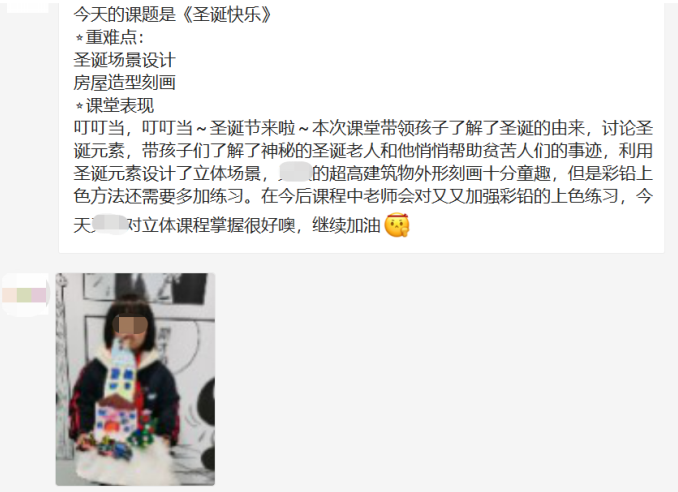课堂点评很多机构都在做,但效果并不如人意。比如我给女儿报名的线下美术机构,每次上完课后,老师都会发一张作品点评,但她点评的大多是我能看到的、已知的部分: