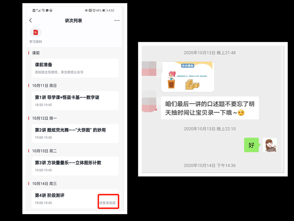 具体做法:只要孩子完成后课程中的每一个环节,助教就会给家长发送反馈信息,呈现形式是卡片或榜单。