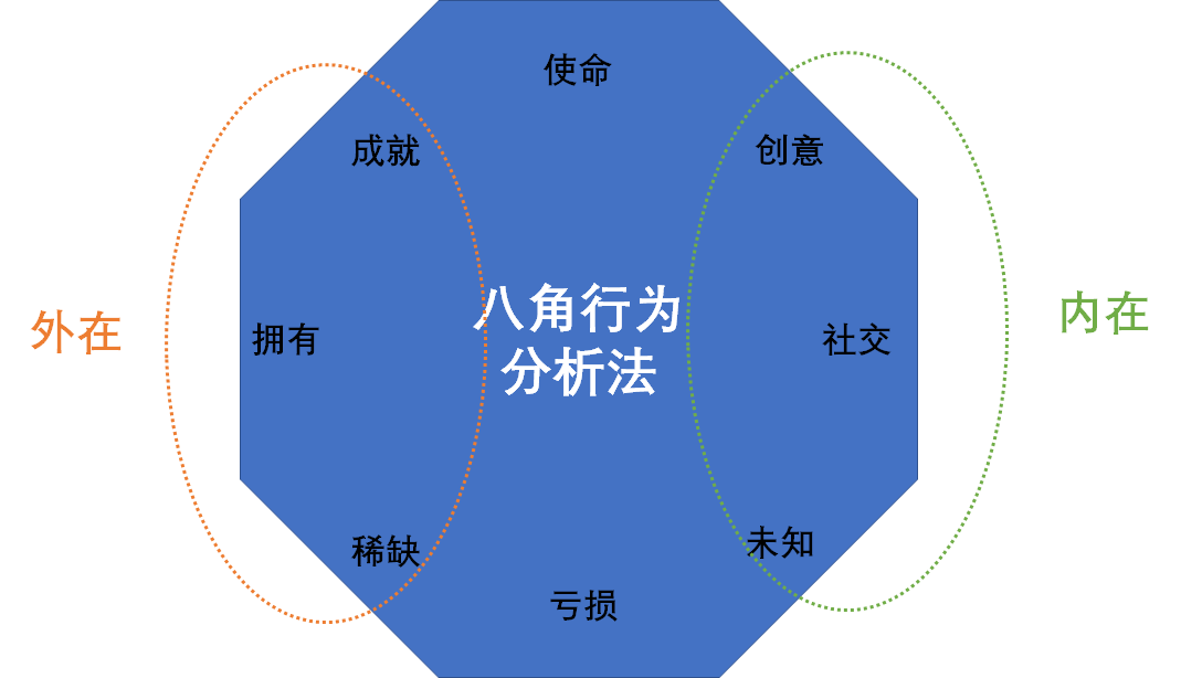 左半边的三个(成就、拥有、稀缺)是外在推动因素,右半边的三个(创意、社交、未知)是内在推动因素。