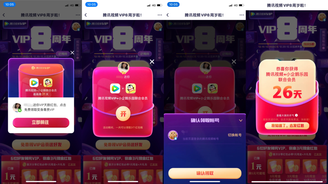 到了用户领取这一步,十分有"仪式感"地将点击领取的步骤分成了三步,虽然不了解背后是否有什么技术困难,但以腾讯视频的实力不应该做不了简化。