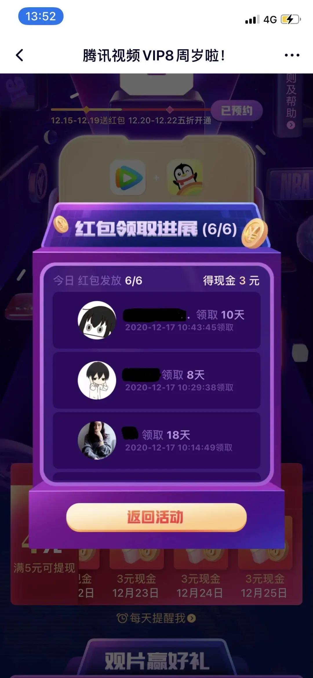 但为了更多的拉新和真正的促活,腾讯视频给出"现金奖励"这样的"杀器",而且非常有节制。营销的过程中,有节制是非常难得的。腾讯视频此次的八周年活动周期不短,满打满算差不多有11天。每天能获得的现金奖励都被明确标记,现金的获得方式也是明确的,一天内邀请六个人领取你分享的VIP红包,即可获得。目标感很强,可操作性也很强,用户分享的意愿也会变强。