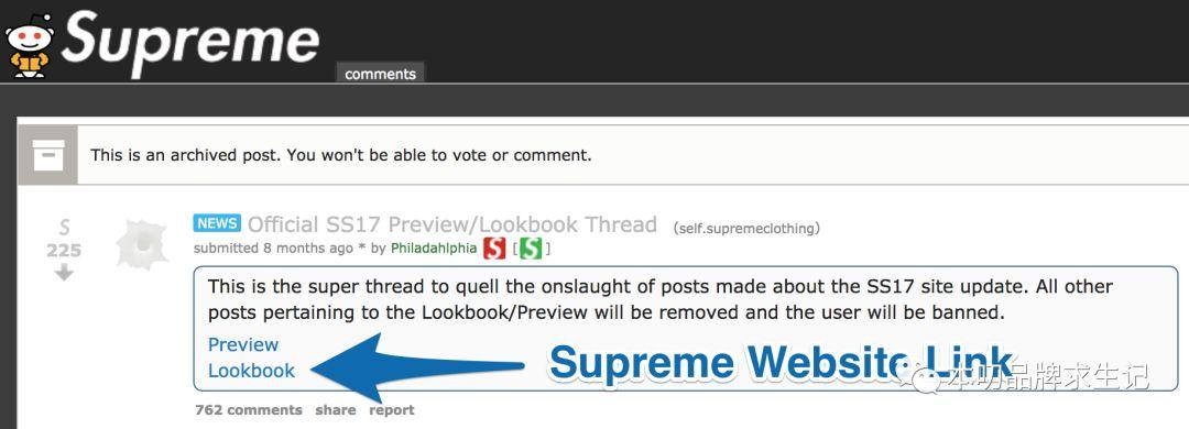 想要Reddit这样的社交论坛上获得流量,Supreme选择找版主发布了超级资讯,直接带上官方网站的新品预览页面链接: