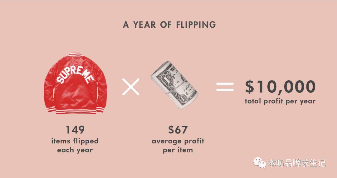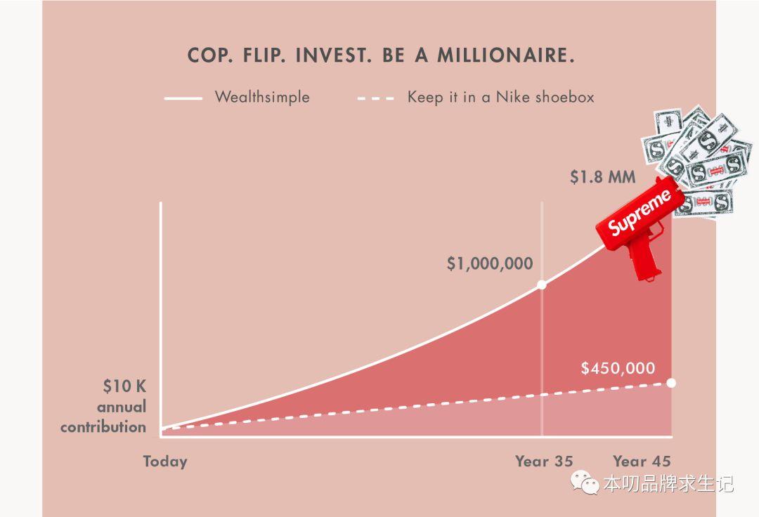 一家纽约投资公司简单算了一下,如果你一年倒卖149件Supreme商品,每件盈利67美元,一年可以赚1万美元。如果你把这一万美元投资出去,按平均年收益5.5%计算,35年后你可以变成百万富翁。
