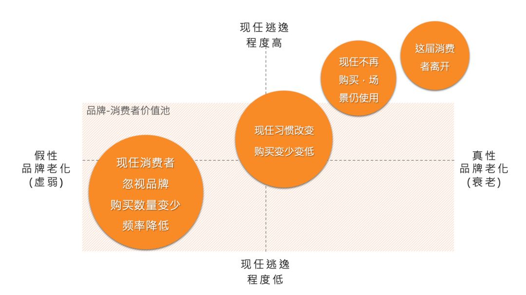 一旦我们打开了从[消费者]到[消费者价值]的视野,就不难发现许多品牌老化症状的出现,实质的原因是[品牌-消费者价值池]内的价值流失了。