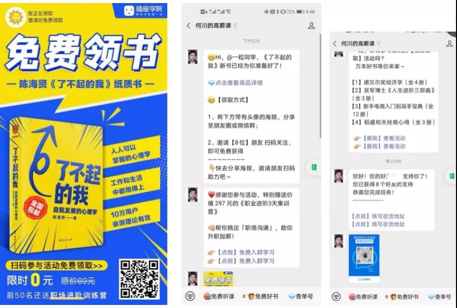 此次活动除了公众号领书活动文章链接外,接触到的就是老用户转发,那对于身边人转发活动来说,更加有吸引力和信服度。