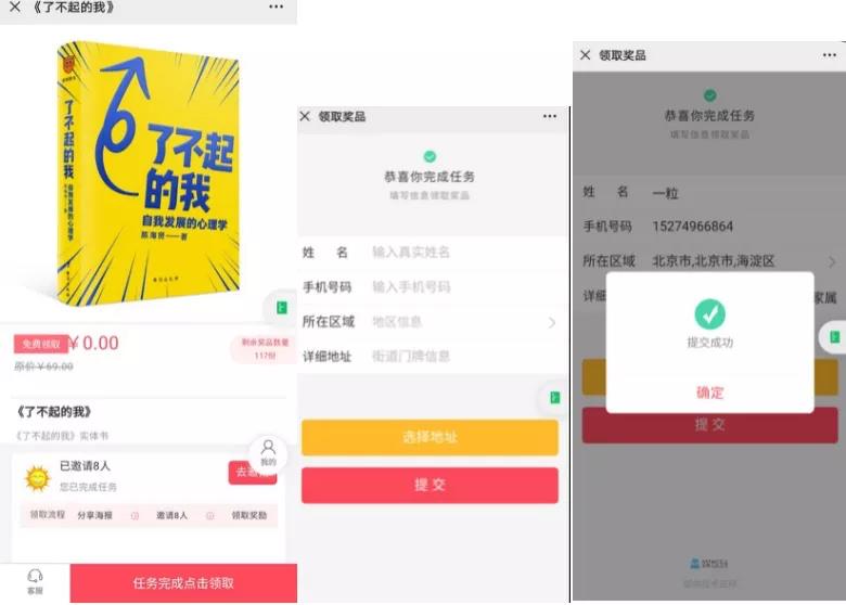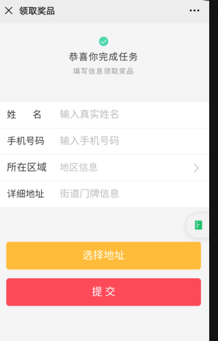 从扫码到转发专属海报流程中,没有获取用户任何的信息,只有到完成任务了,才填写用户收货信息。且上方显示:恭喜用户完成任务,填写信息领奖品。