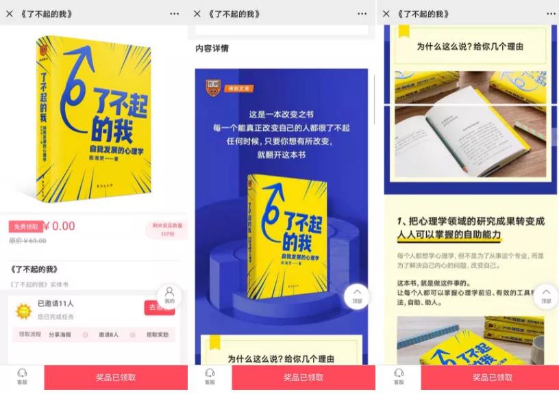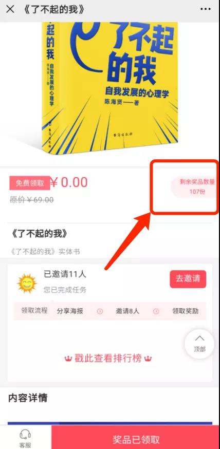 活动页面,只有奖品相关的内容。例如奖品详情介绍、邀请情况、奖品数等,都是为了集中用户分享的注意力,而不被其他影响。