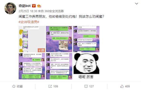都说微博上沙雕网友欢乐多,沙雕文化在微博平台的确很受欢迎,自然会有相关的bot账号出现。