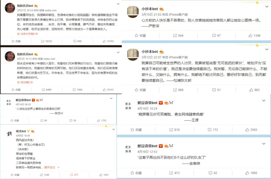 看似名言语录向的bot账号要更好做一点,其实并不然,相比于图片和视频,文字的直接感染能力更弱。