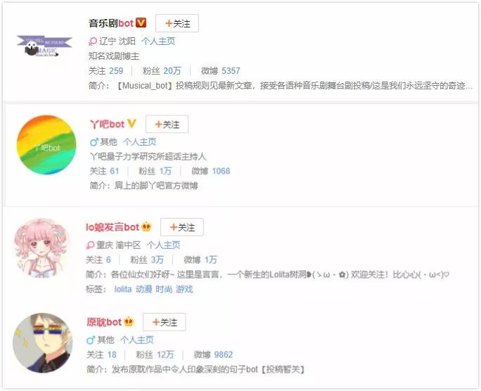 又比如@丫吧bot,实际上是致力于为lgbt群体发声的账号,还有类似的@lo娘发言bot、@原耽bot等等。