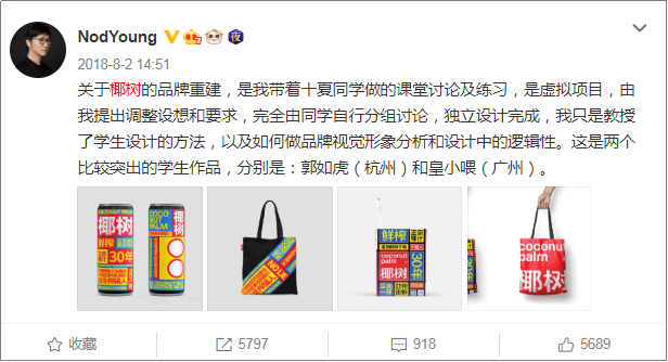 比如杭州的工作坊“设计十夏”设计师NodYoung就曾带领学生做了全新的包装改造设计,给椰树椰汁的品牌建设出谋划策,设计出时尚的饮料包装、环保袋等周边。