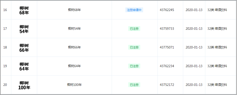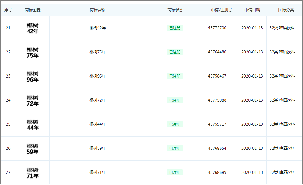 透过企查查可以发现,椰树椰汁早已申请注册“椰树42年”、“椰树59年”、“椰树75年”、“椰树100年”,这是打算年年换一个商标包装,大概是对自己产品拥有足够底气。