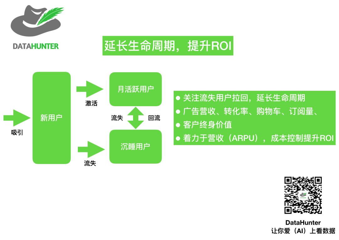 随着用户快速增长,产品不断完善,产品在进入成熟期前后,数据分析师关注的重心开始从用户生命周期的前半段(吸引、激活、留存)往后半段(流失、回流)开始偏移,同时关注商业化转化路径。