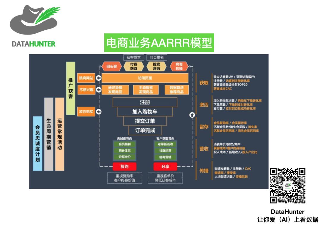 ①用户获取模型:AARRR从整个用户生命周期入手,包括Acquisition用户获取,Activation用户转化,Retention用户留存与活跃,Revenue用户产生收入,到发起传播Refer。