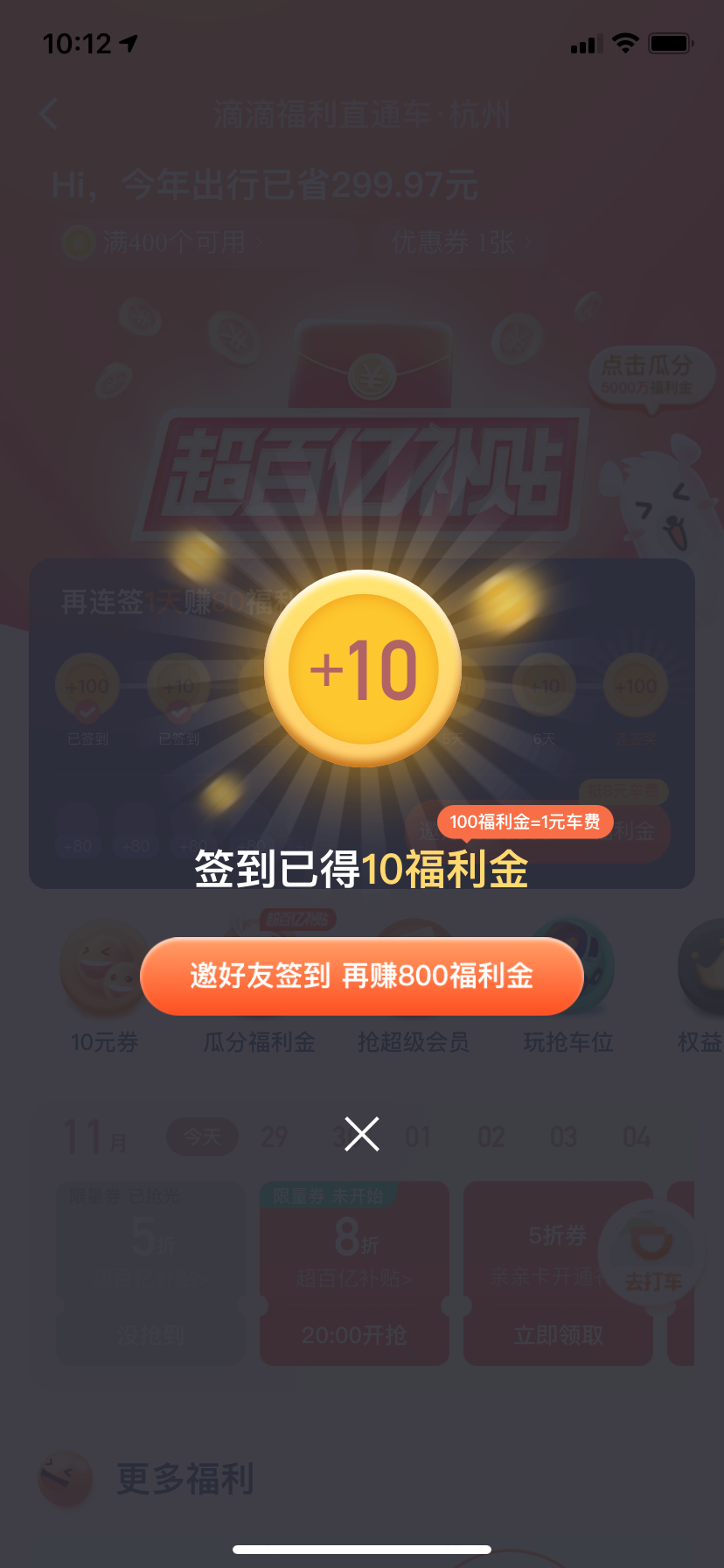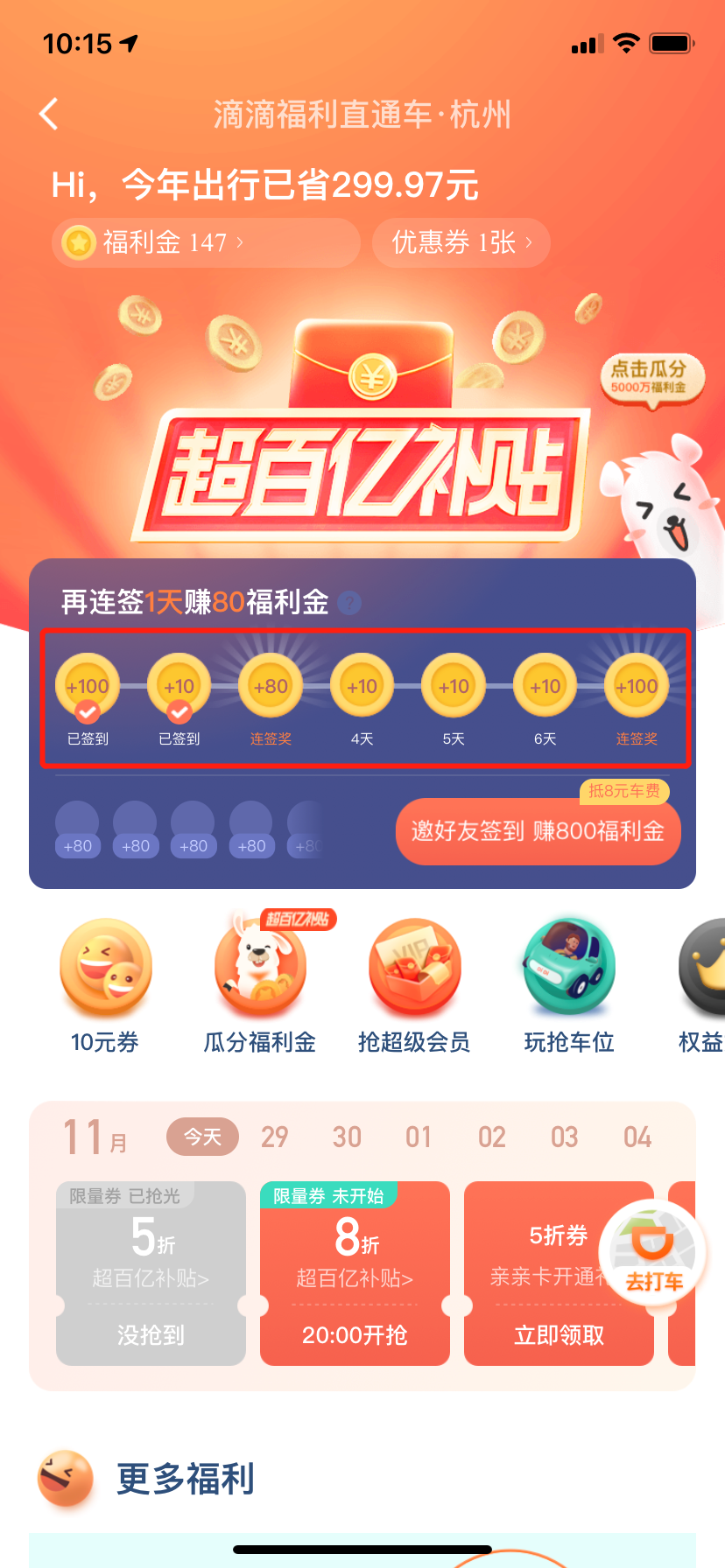 活动介绍:"超百亿补贴"是滴滴做的赚取福利金的活动,福利金是滴滴平台发放给乘客的一种可累计奖励工具,累计到一定数量后可在快车订单(含拼车、优享)或者专车订单直接抵扣到打车费用;在本次活动当中,以福利金为钩子,用签到、薅羊毛的活动形式让用户去分享赚取更多福利金。