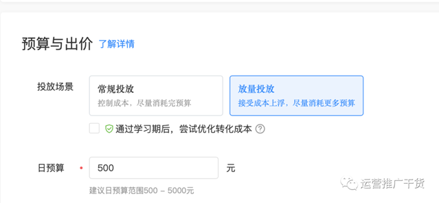 以前叫做自动出价,现在已经更名为放量投放了。这个功能很有争议,很多优化师吐槽花钱倒是很快,不只是起量,简直是起飞,成本不敢看的那种。奇了,我觉得挺好用。
