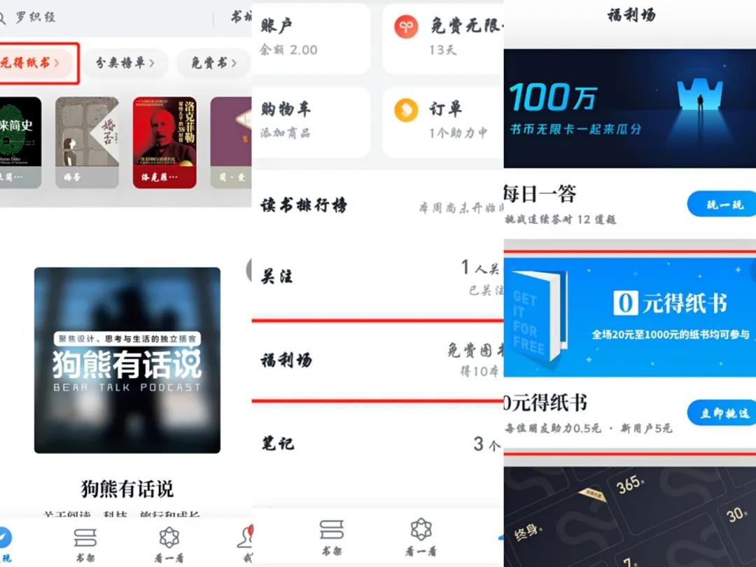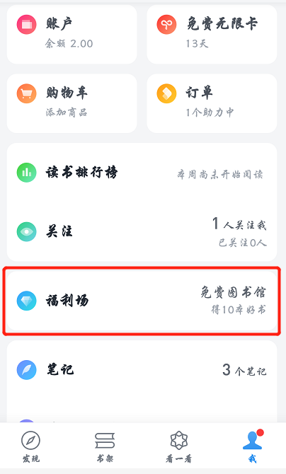 活动期间,在个人中心里,【福利场】的文案设置成【0元领纸书】,吸引用户点击。