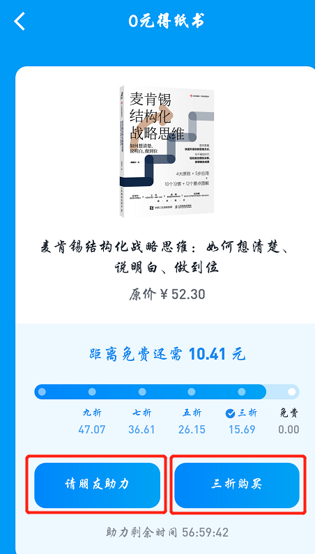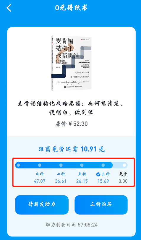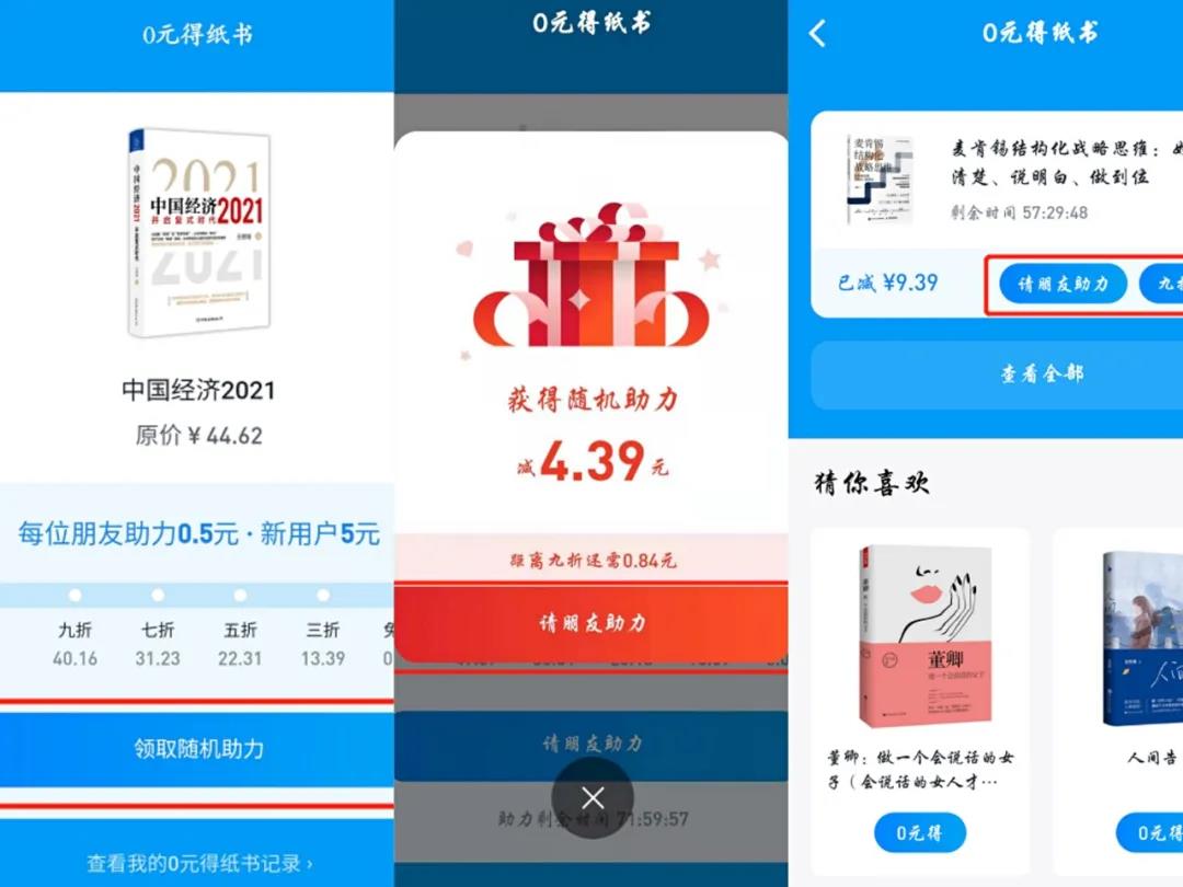参与活动就有机会享受0元领书,不管邀请的好友是新用户(减0.5元)还是老用户(减5元),都能减一部分书价。即便最后完成不了最终的0元目标,也有【九折】、【七折】、【三折】可供选择,依然能够享受特惠价,让用户觉得薅到了羊毛。