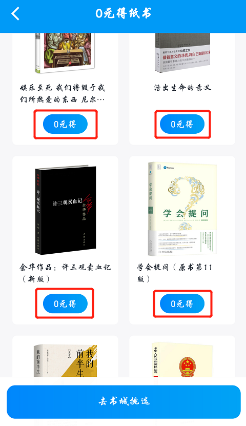 用户选择【去书城挑选】后,直接跳转到活动专场,让用户方便挑选书籍。将每本书的【0元得】设置得更明显、更醒目些。