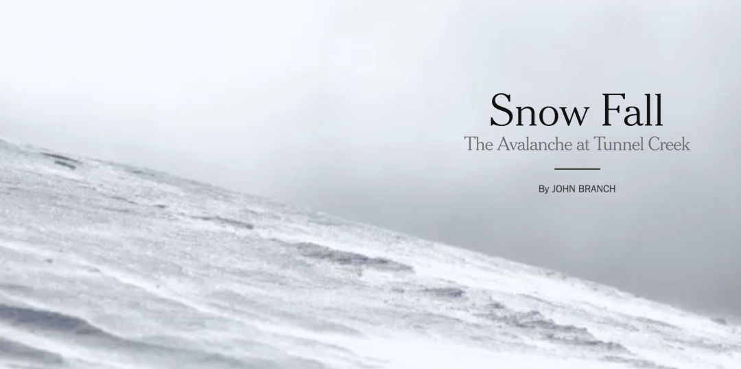 24、2012年:《纽约时报》发布了著名的数字化专题报道《雪崩》Snow Fall,这标志着长篇可视化多媒体新闻取得了长足发展,该报道至今仍被奉为经典。