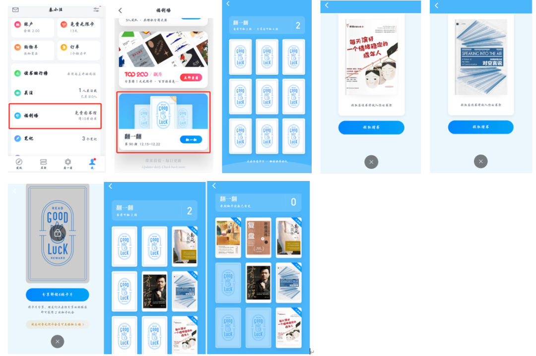 用户在完成一次翻牌后,可弹出一个书籍专区,用户可选择自己喜欢的书籍进行领取,提高用户的兴趣度和体验感。
