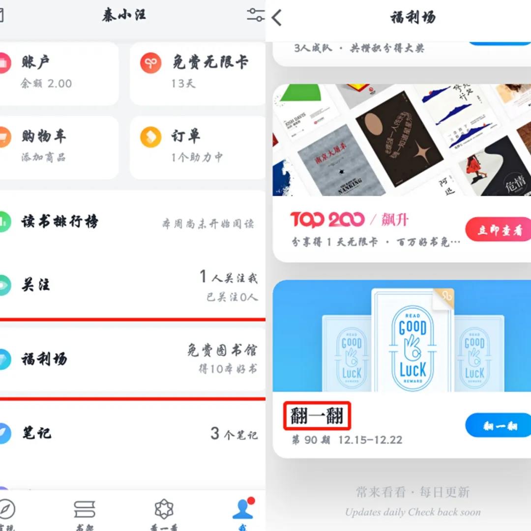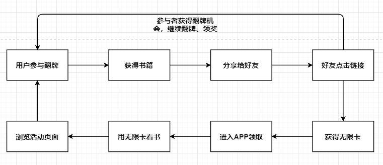 助力者点击链接后,还能领取20天的无限卡。页面会引导去APP领取,用户进入APP,有可能也参与【翻牌】活动,也有可能看书、浏览其他内容栏目。由此提高APP的活跃度,形成一个闭环。