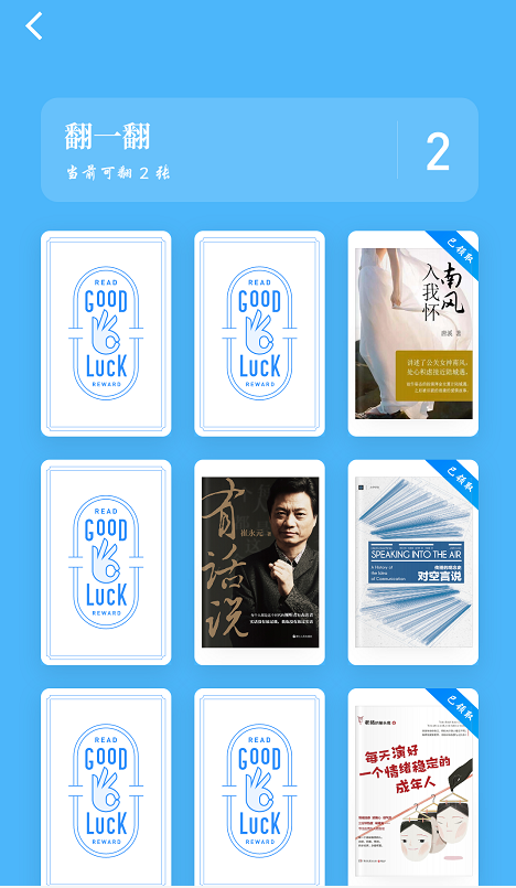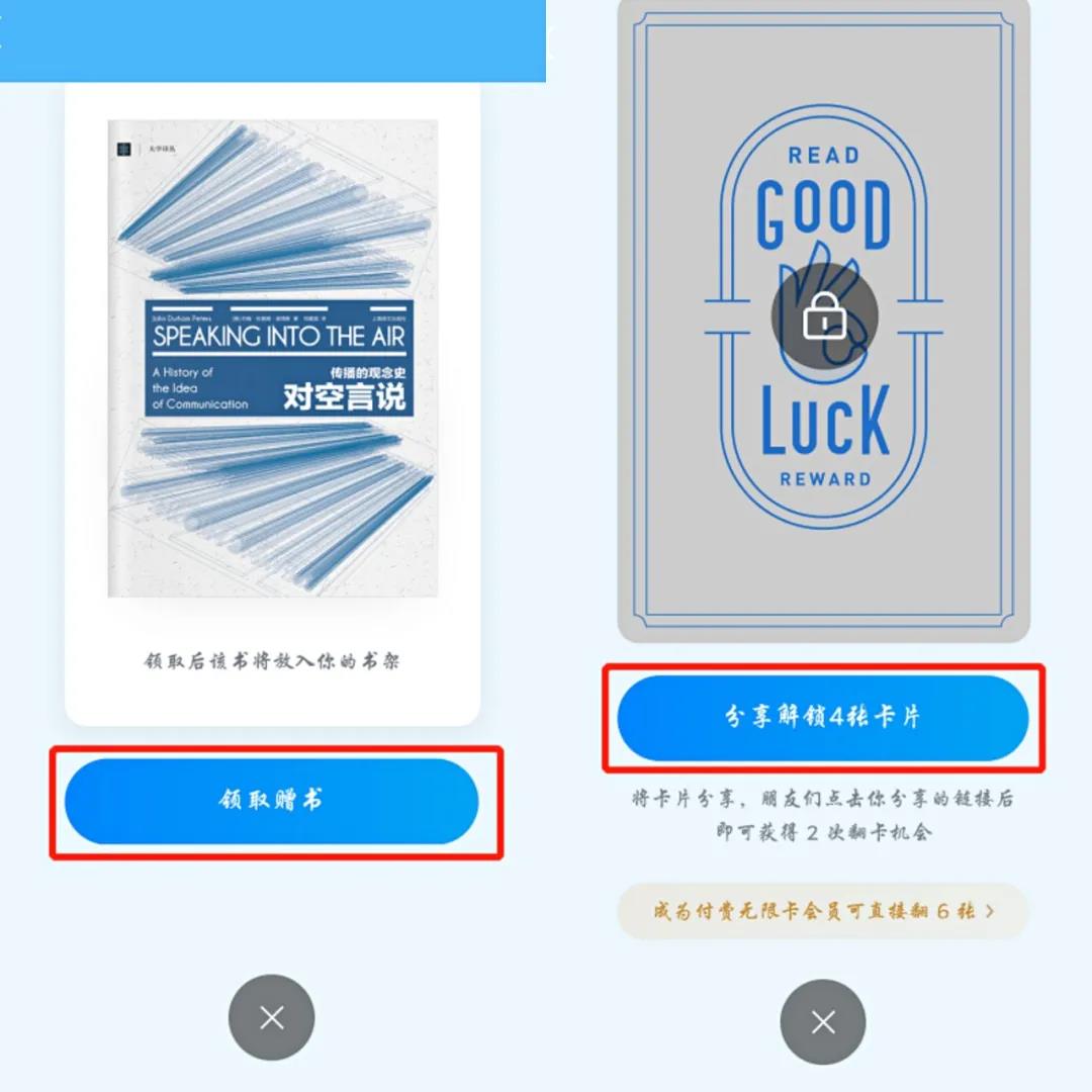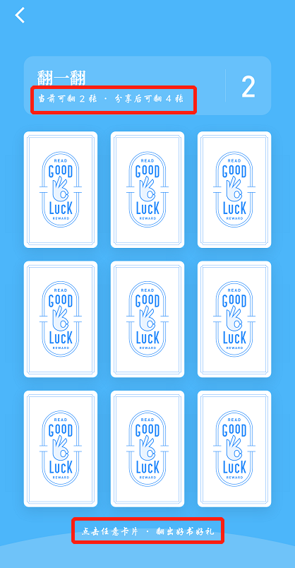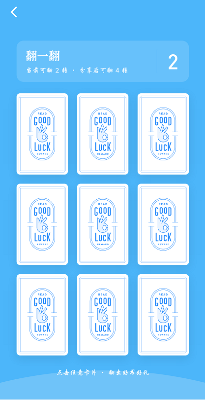 每张牌都能翻到奖品,用户会更有参与的动力,随即分享给好友,继续翻牌,继续获得书籍。