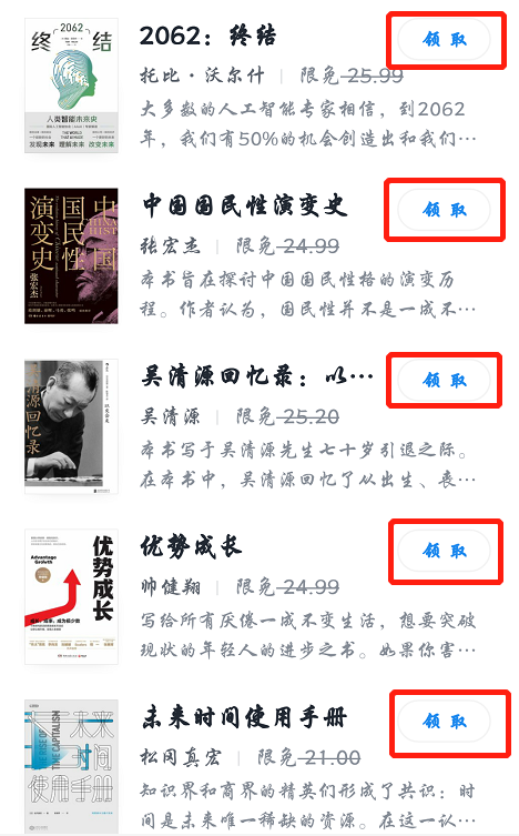 (类似下图,提供不同书籍供用户选择,每本书籍后面都有【领取】键。)