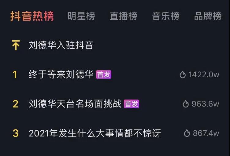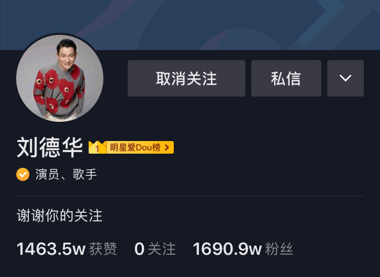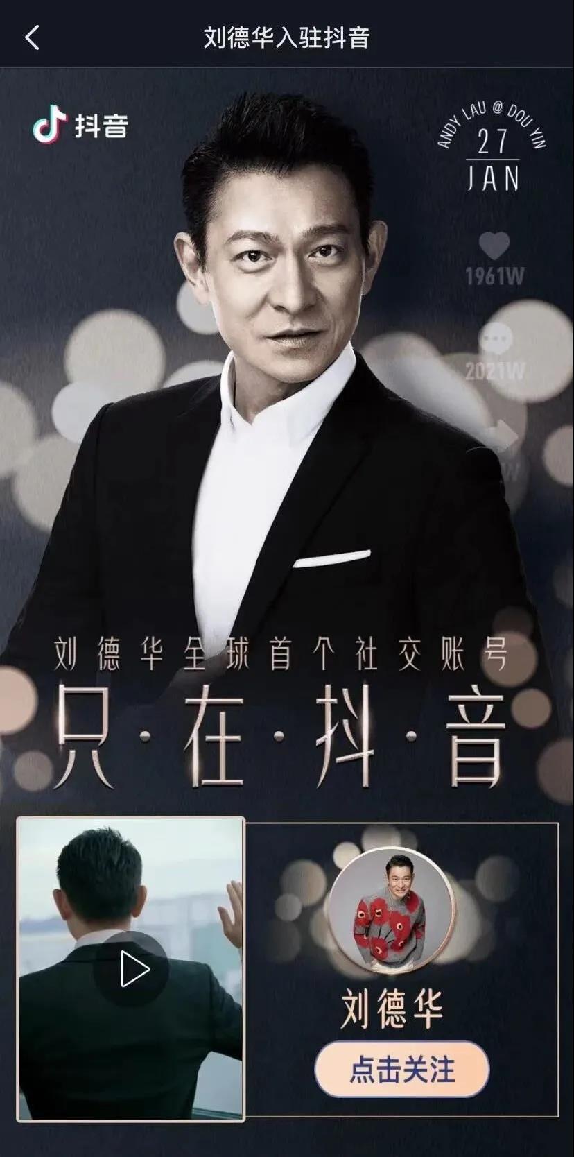 抖音官宣,刘德华开通了个人的全球首个社交账号抖音号,截至发稿前,其粉丝突破1690万+,此数据还在持续攀升中。