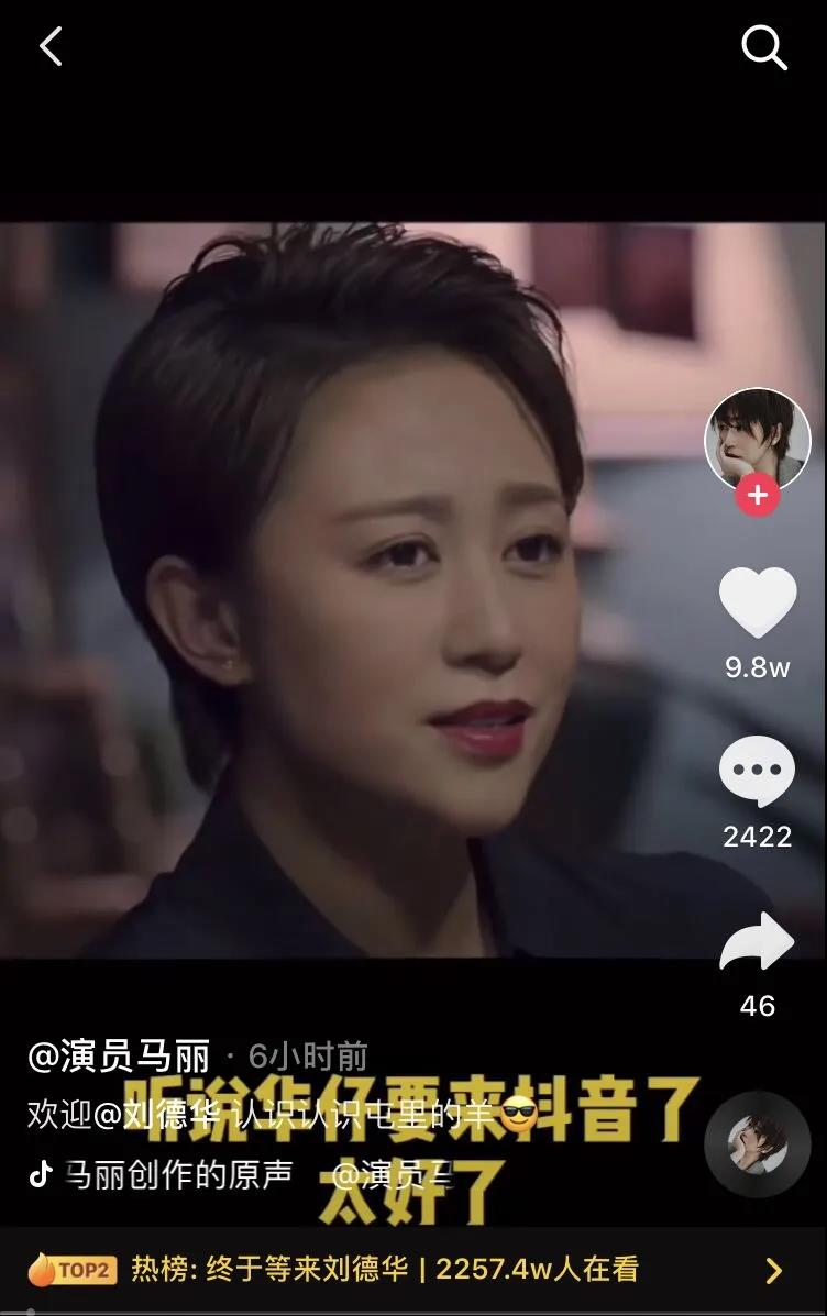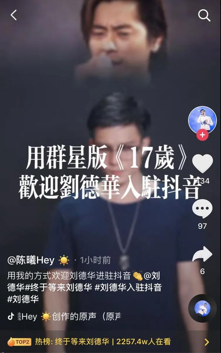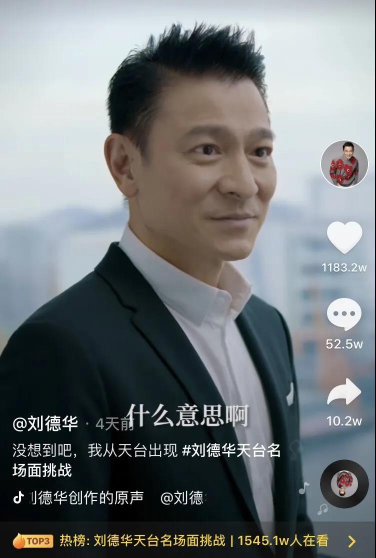 在其账号下的首个视频"刘德华天台名场面挑战",获得超1180万+点赞,该作品也迅速登上抖音热榜前三的位置。