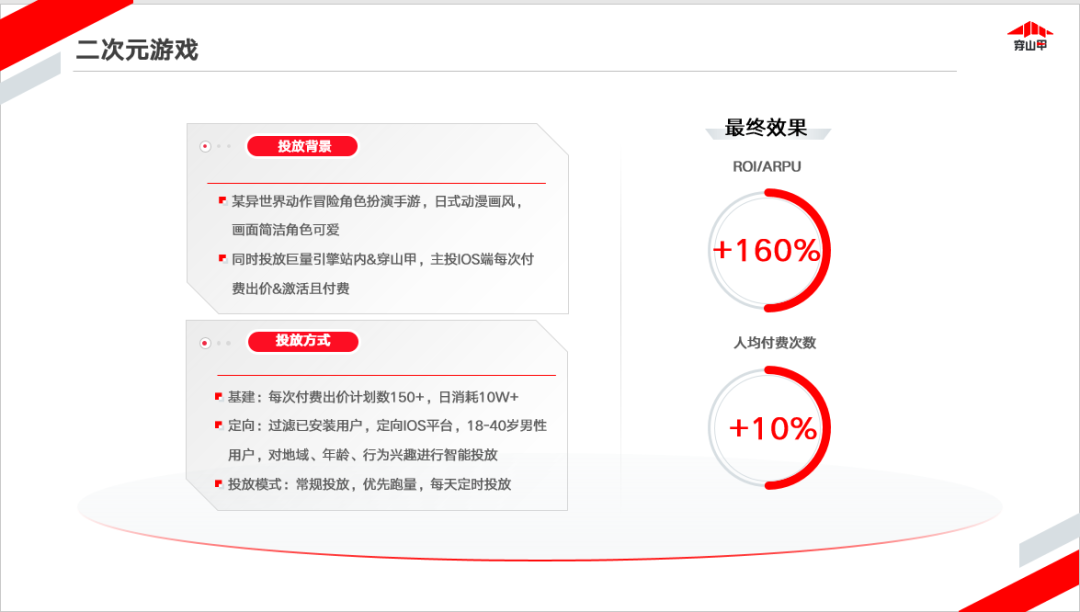 穿山甲平台有一个案例的数据还挺明显的,用了每次付费出价之后,人均付费次数提升了10%,ROI也有了大幅提升。